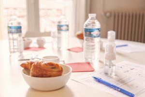 Dans une cuisine accueillante, votre hôtesse vous propose des mets gourmands et variés pour rythmer vos journées de travail :